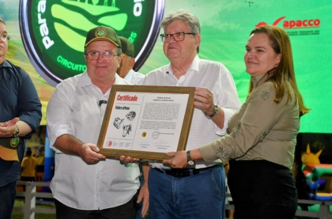 Durante a solenidade, Azevêdo recebeu o certificado que reconhece a Paraíba como estado livre de febre aftosa sem vacinação. Ele destacou o fortalecimento das feiras agropecuárias no estado, que saltaram de três edições anuais em 2019 para mais de 60 em 2025. “Uma feira como essa, com mais de 2.100 animais expostos e a expectativa de R$ 50 milhões em negócios, confirma que apoiar quem produz e investe é o caminho certo. A Paraíba vive um bom momento econômico porque o governo tem identificado as demandas de todos os setores”, afirmou o governador.