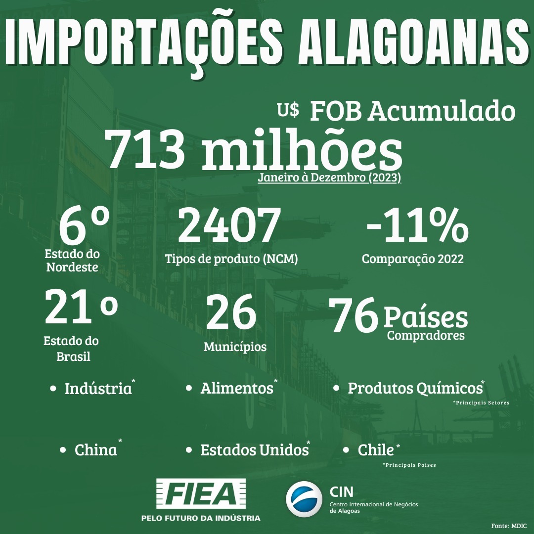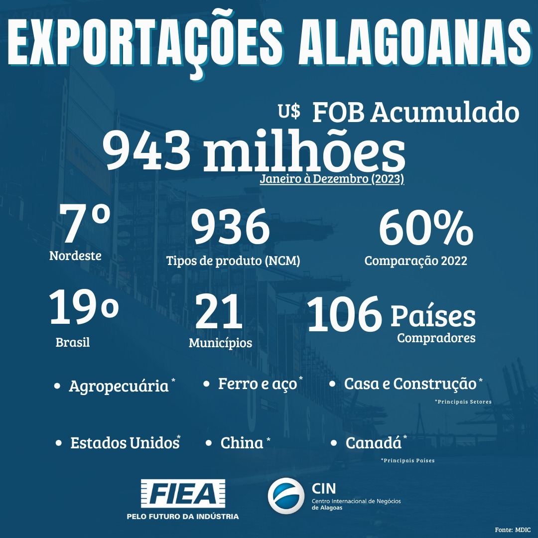 Esses dados foram divulgados no relatório mensal elaborado pela Área Internacional da Federação das Indústrias do Estado de Alagoas (Fiea), com base em informações do Observatório da Indústria de Alagoas e do Ministério do Desenvolvimento, Indústria, Comércio e Serviços (MDIC) – Comex Stat. Em 2023, os principais parceiros comerciais de Alagoas foram os Estados Unidos, China e Canadá, nessa ordem.