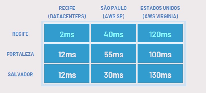 Quanto a posição geográfica, a localização de Recife garante uma baixa latência (tempo mínimo de atraso na transmissão de dados entre dois pontos) para várias cidades da região, em comparação com outros centros.