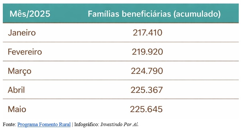 O Programa Fomento Rural alcançou 225.645 famílias beneficiárias no Nordeste até maio de 2025, segundo dados oficiais do Ministério do Desenvolvimento e Assistência Social, Família e Combate à Fome (MDS). O número representa crescimento de 3,8% em relação a janeiro, quando o total acumulado era de 217.410 famílias.
