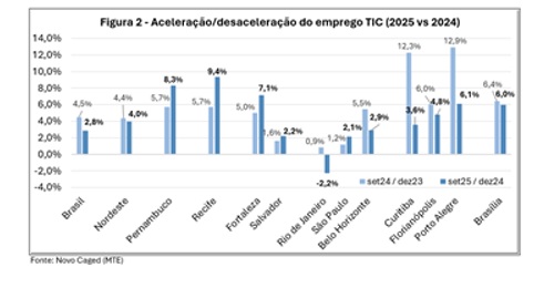Já em relação aos empregos formais em TIC, dados do Novo Caged mostram que após um período de estabilização pós-pandemia até o final de 2023, houve uma “aceleração notável” na geração de vagas. Com isso, Recife alcançou 17 meses consecutivos de elevação, somando 12.293 profissionais com carteira assinada no setor até dezembro de 2025.